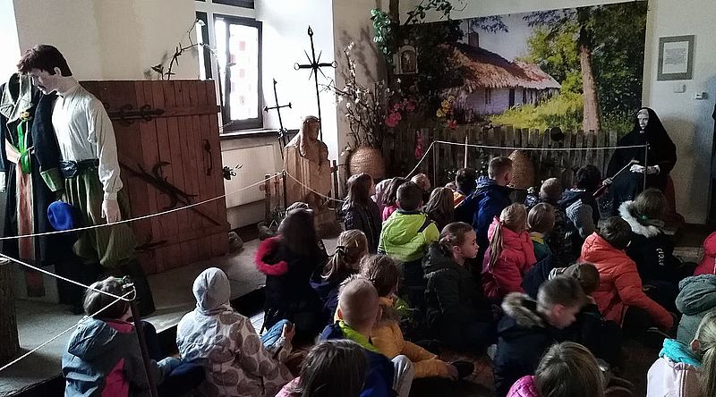Kolejnym punktem wycieczki było zwiedzanie zamku i poznanie jego historii. Warownia została zbudowana przez króla Polski Kazimierza Wielkiego najprawdopodobniej w latach 1357 – 1365. W wyniku wielu zawirowań dziejowych zamek uległ dewastacji i dopiero w 1964 roku przystąpiono do jego odbudowy, wznosząc tzw. Dom Nowy (dzisiejszą siedzibę Muzeum) i częściowo rekonstruując zniszczone fragmenty budowli. Uczniowie dowiedzieli się również, jak w przeszłości na Ziemi Łęczyckiej żyli zwykli ludzie i poznali legendę o diable Borucie, który często przybierał postać szlachcica i podobno do dziś mieszka w zamkowych piwnicach. Niestety, nikomu nie udało się go spotkać, więc ci, którzy liczyli na dreszczyk emocji, czuli się trochę zawiedzeni.