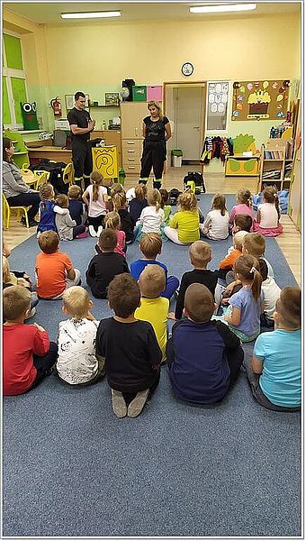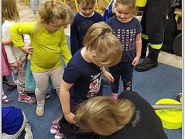 Na zakończenie spotkania wszystkie dzieci utrwaliły sobie numer alarmowy do straży pożarnej i sytuacje, kiedy powinny go używać. Spotkanie zakończyło się pamiątkowym zdjęciem ze strażackim wężem.