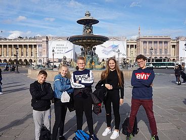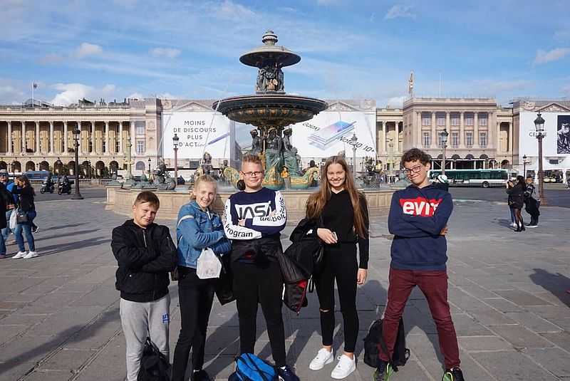 Dalsza część wycieczki odbyła się metrem, którym dotarli uczniowie wraz z opiekunami do galerii Lafayette. Tam był wspaniały obiad. Dalsze zwiedzanie przebiegało obok budynku Opery, kościoła św. Magdaleny aż do placu de la Concorde (Zgody). Dominującym obiektem na placu jest mierzący 23 m obelisk, podarowany w XIX wieku dla króla Ludwika Filipa przez wicekróla Egiptu. Obelisk pochodzi wprost z Teb, ze świątyni Ramzesa II. Niezwykłą ciekawostką jest fakt, iż obelisk pełni równocześnie funkcję zegara słonecznego, co czyni go największym tego typu chronometrem na świecie. Charakterystycznym elementem placu są także dwie przepiękne, niezwykle ozdobne fontanny – Fontanna Mórz i Fontanna Rzek.
